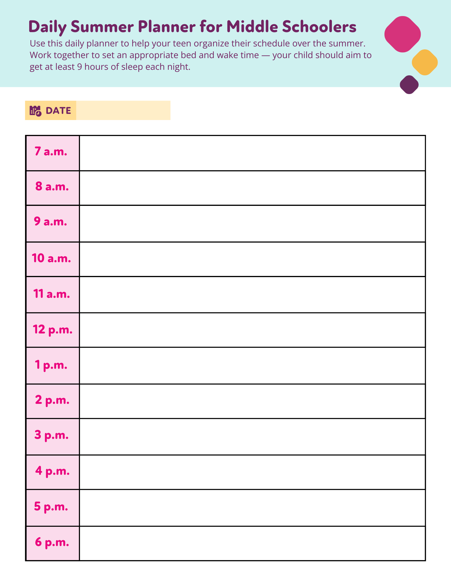 Once they have their goals and activities in mind, they can create their summer routine schedule by downloading our Summer Routine Schedule for Middle Schoolers template or create one of their own.